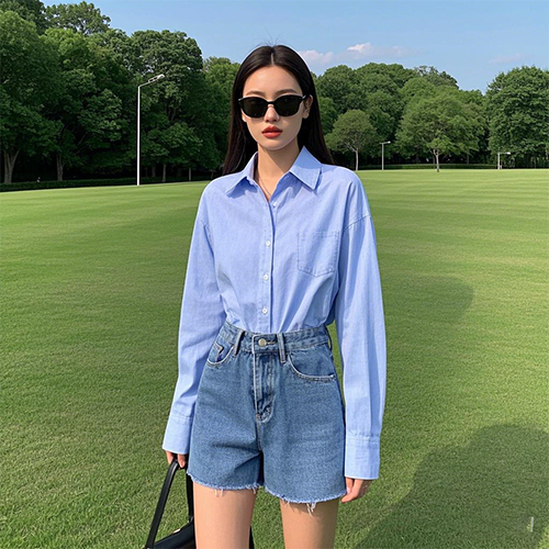 牛仔短褲除了搭配棉質(zhì)上衣之外、襯衫也能詮釋出獨(dú)具風(fēng)格的搶眼印象。