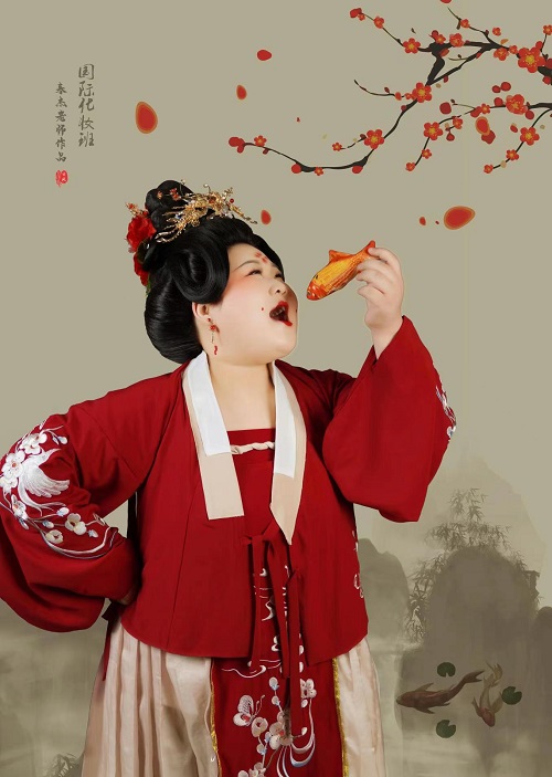 將額間花瓣微微暈染,妝面修飾與現(xiàn)代感融合。
