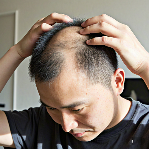 四級脫發(fā):前額明顯禿發(fā),整體頭頂部位稀疏,但頭發(fā)沒有完全脫落,還有一些細(xì)軟的頭發(fā)存在。