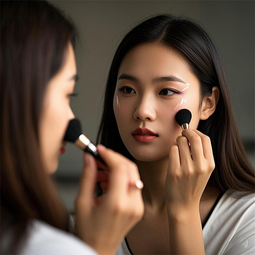 1、用粉底刷刷上一層粉底液,然后用三色遮瑕的淺色涂在需要提亮的位置并用粉底刷均勻刷開。
