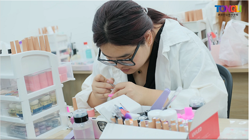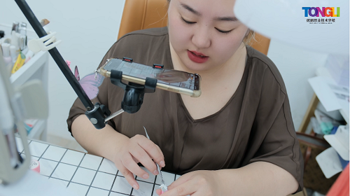 不同美甲款式需要不同的甲油膠去完成,每一抹甲油膠的選取與搭配,看似簡單,實則蘊含著無數(shù)的創(chuàng)意和技巧。美甲師通過疊加、暈染、鑲嵌等手法,需要將不同的甲油膠交疊在一起,讓平凡變得非凡,完成美甲作品。