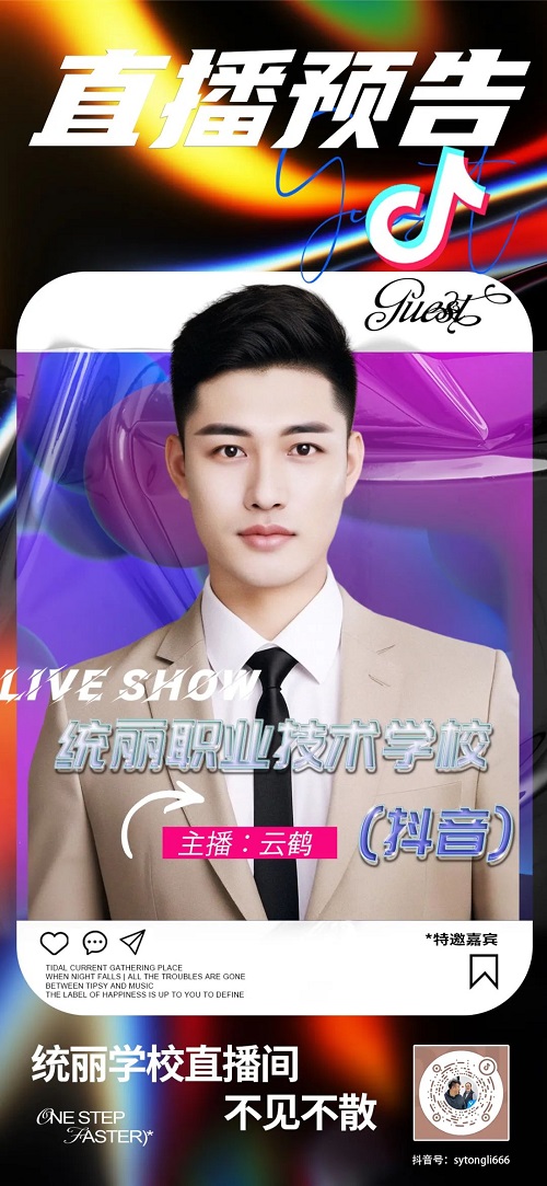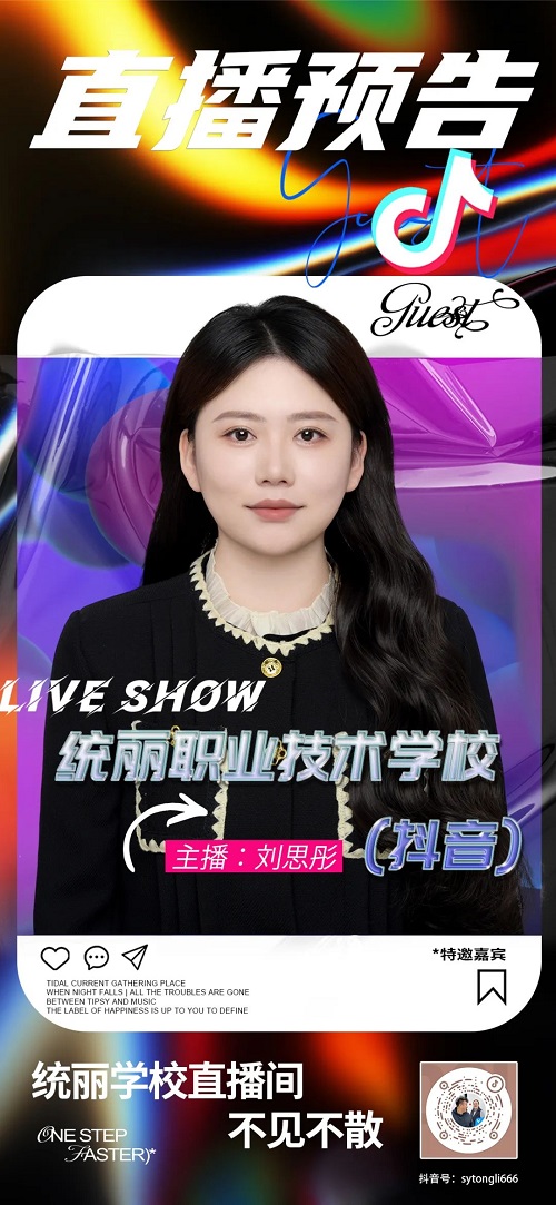 直播平臺與賬號:抖音統(tǒng)麗職業(yè)技術(shù)學校直播時間:13-16點直播平臺與賬號:抖音統(tǒng)麗職業(yè)技術(shù)學校