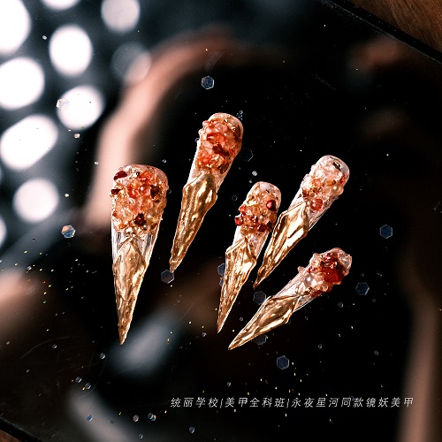永夜星河同款鏡妖美甲,金色魔鏡粉造型,搭配水晶碎石,無疑是美甲藝術(shù)中的璀璨明珠。在完成基礎(chǔ)的指甲護理與打磨后,沈陽美甲學校帶大家進入這款美甲的核心制作環(huán)節(jié)。