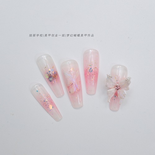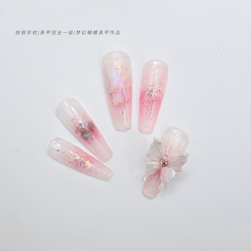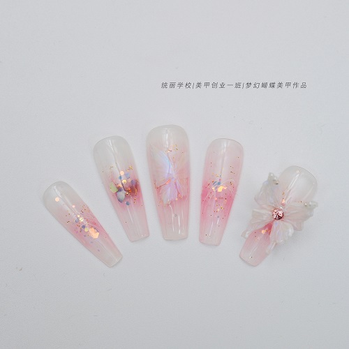 在這晶瑩剔透的甲面上,藝術(shù)家以細(xì)膩的筆觸,運(yùn)用水彩技法,精心繪制了兩只翩翩起舞的蝴蝶。它們輕盈地棲息于指尖,翅膀上的色彩漸變?nèi)缤爝吔k爛的云霞,又似雨后初晴時(shí)空中懸掛的彩虹,既夢(mèng)幻又充滿(mǎn)生機(jī)。蝴蝶的翅膀邊緣,以銀白色細(xì)線勾勒出精致的脈絡(luò),不僅增強(qiáng)了立體感,更添一抹清冷高雅的氣息,仿佛它們剛從清晨的薄霧中振翅而出,帶著露珠的清新與晨風(fēng)的涼爽。