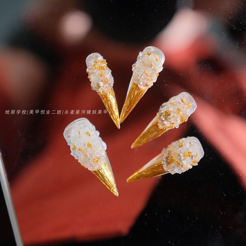 金色的魔鏡粉和碎鉆的完美結(jié)合,美甲師的巧手刻畫出紋理,妖艷魅惑展現(xiàn)的淋漓盡致,每一片碎鉆在燈光下輕輕閃爍,仿佛夜空中最璀璨的星辰,悄然降落在陳都靈的指尖。
