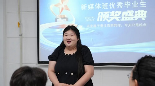 之后,優(yōu)秀學(xué)生代表王月走上發(fā)言席。她以自己的親身經(jīng)歷為切入點(diǎn),分享了在新媒體班學(xué)習(xí)生活的酸甜苦辣。從初入班級時對新媒體的懵懂,到在老師的悉心指導(dǎo)下逐漸掌握各種專業(yè)技能。王小月的真誠分享,讓大家看到了她的努力與堅(jiān)持,展現(xiàn)了新媒體班學(xué)員們不畏困難、積極進(jìn)取的精神風(fēng)貌。她的發(fā)言不僅引起了同學(xué)們的強(qiáng)烈共鳴,更激勵著在場的每一位同學(xué)勇敢追逐夢想。