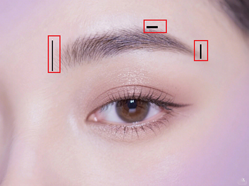 化眉的第一步,先來(lái)找準(zhǔn)眉頭、眉峰、眉尾的位置。眉頭的位置就在內(nèi)眼角到鼻頭中間的這條延長(zhǎng)線上。如果眼距較近的女生,可以把眉頭位置稍稍往后移一點(diǎn)。外眼角的延長(zhǎng)線上就是我們的眉峰位置,眉尾則是我們外眼線的位置,延長(zhǎng)線上去的點(diǎn)就是我們眉尾的位置。