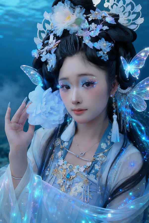 眼妝:以漸變藍(lán)調(diào)為核心,營造 “深海與夜空交融” 的層次: