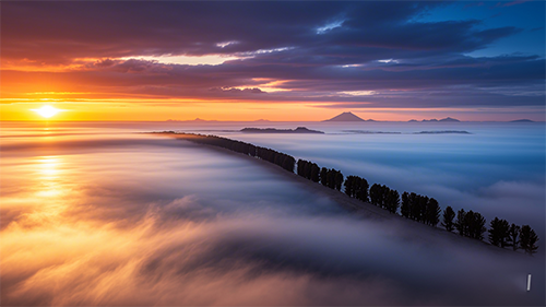 作品中的日出、薄霧和漓江的水面反光, 以及山峰的剪影效果極為出色。沈陽攝影培訓機構提示大家這個時候要通過減少1級曝光量,讓層疊的峰嶺即可成剪影,還可以讓云海上的紅色彩更加的出色。