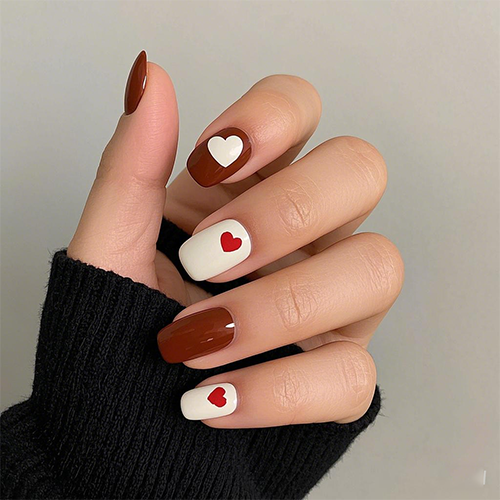 步驟二:中指和小拇指整甲刷上一層米白色甲油;大拇指、食指、無名指整甲刷上一層咖色甲油;待干,為了使顏色更加飽滿,待干后再各刷上一層甲油。