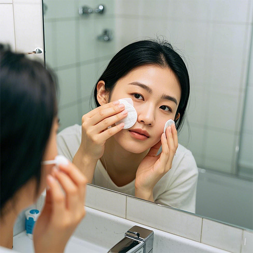 用卸妝水倒入卸妝棉上,使卸妝棉充分浸濕。隨后將浸濕的卸妝棉敷于眼周約10-20秒左右,自上而下輕輕地將眼線擦拭整潔,隨后輕輕向眼角兩邊擦拭。沈陽化妝學(xué)校建議大家對(duì)于細(xì)小的眼妝殘余可以使用棉簽蘸取適量卸妝水,細(xì)心清理干凈。